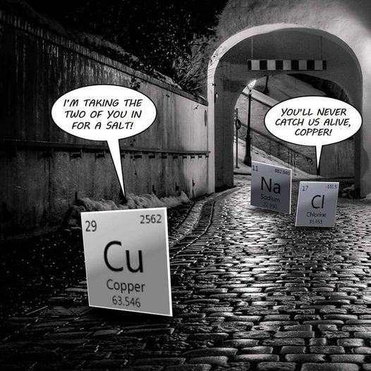 NOTE: I would not say that I’m ‘IN TO‘ Chemistry, but I do know that in the Periodic Table of Elements that CU means Copper (Kupfer) and that putting together Na (Sodium) and Cl (Chlorine) makes Salt. Now you need to know some street language / Colloquialisms to understand this joke. Also, did you know that if you had too much of either Na or Cl it could kill you, but put them together and if you do not get enough Salt, you will die….